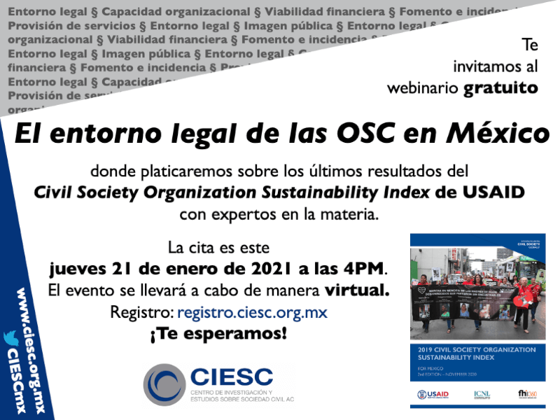 El entorno legal de las OSC en México en relación a los últimos resultados del Civil Society Organizatión Sustainabiliy Index. Este proyecto de USAID, del cual el Centro de Investigación y Estudios sobre Sociedad Civil es socio implementador para México, busca aportar un diagnóstico del entorno en el que se desarrollan las organizaciones de la sociedad civil alrededor del mundo. 2019 fue un año lleno de retos para las organizaciones mexicanas, pero ¿cómo nos fue los aspectos legales que mide el índice? Acompáñanos el próximo jueves 21 de enero a las 4PM para descubrirlo; regístrate para obtener la liga.