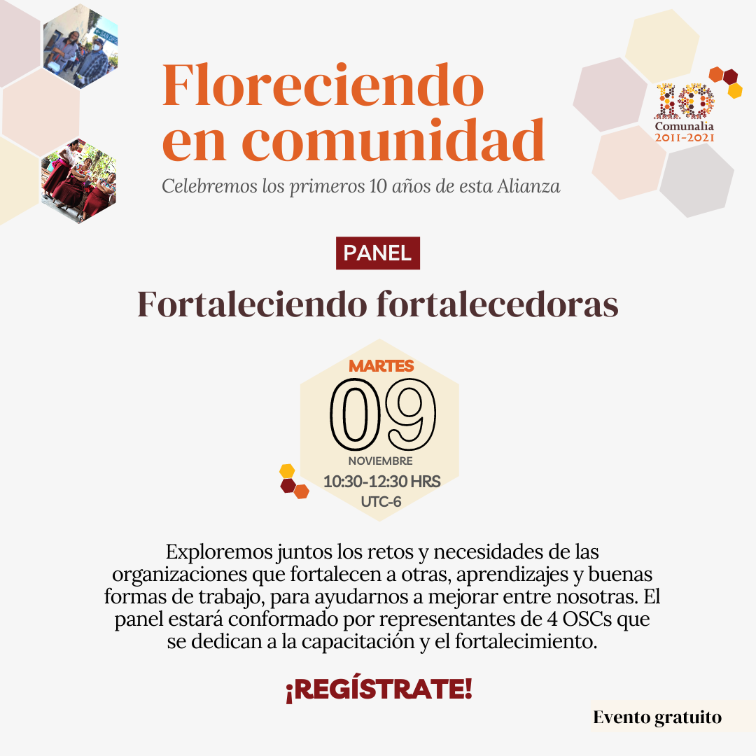 El martes 9 de noviembre, de 10:30 a 12:30 horas -tiempo de la CDMX-, se desarrollará el Panel: Fortaleciendo fortalecedoras donde Lucía Hidalgo, de Alternativas y Capacidades, David Pérez Rulfo de Corporativa de Fundaciones, Cristina Ruiz de CEMEFI y Mauricio Canseco de yCo. Centro de Fortalecimiento compartirán sus aprendizajes, reflexiones y retos de las organizaciones especializadas en la capacitación y fortalecimiento de otras OSCs. [Para asistir, regístrate aquí]