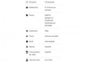 En cada curso puedes encontrar la dedicación en número de semanas y horas a la semana, el nivel de dificultad e idioma entre otras características: