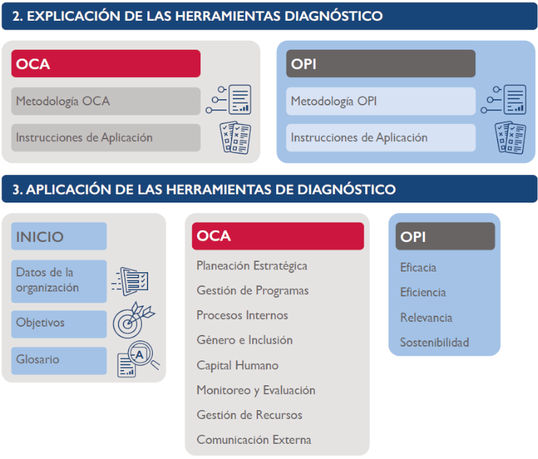 La Herramienta Integrada de Diagnóstico del Programa es un producto de la innovación y la energía creativa que Social Impact, sus organizaciones socias y USAID / México han dedicado a mejorar las metodologías de desarrollo de capacidades con un enfoque sistémico. Las personas facilitadoras pueden utilizar esta herramienta para aplicar los instrumentos de evaluación OCA (Diagnóstico de Capacidad Organizacional), OPI (Índice de Desempeño Organizacional), y el Mapeo de Actores, además de registrar sus observaciones cualitativas, redactar recomendaciones preliminares, extraer resultados y generar gráficos para demostrar los hallazgos. Las OSC pueden optar por aplicar ellas mismas la herramienta de forma completa o modular.