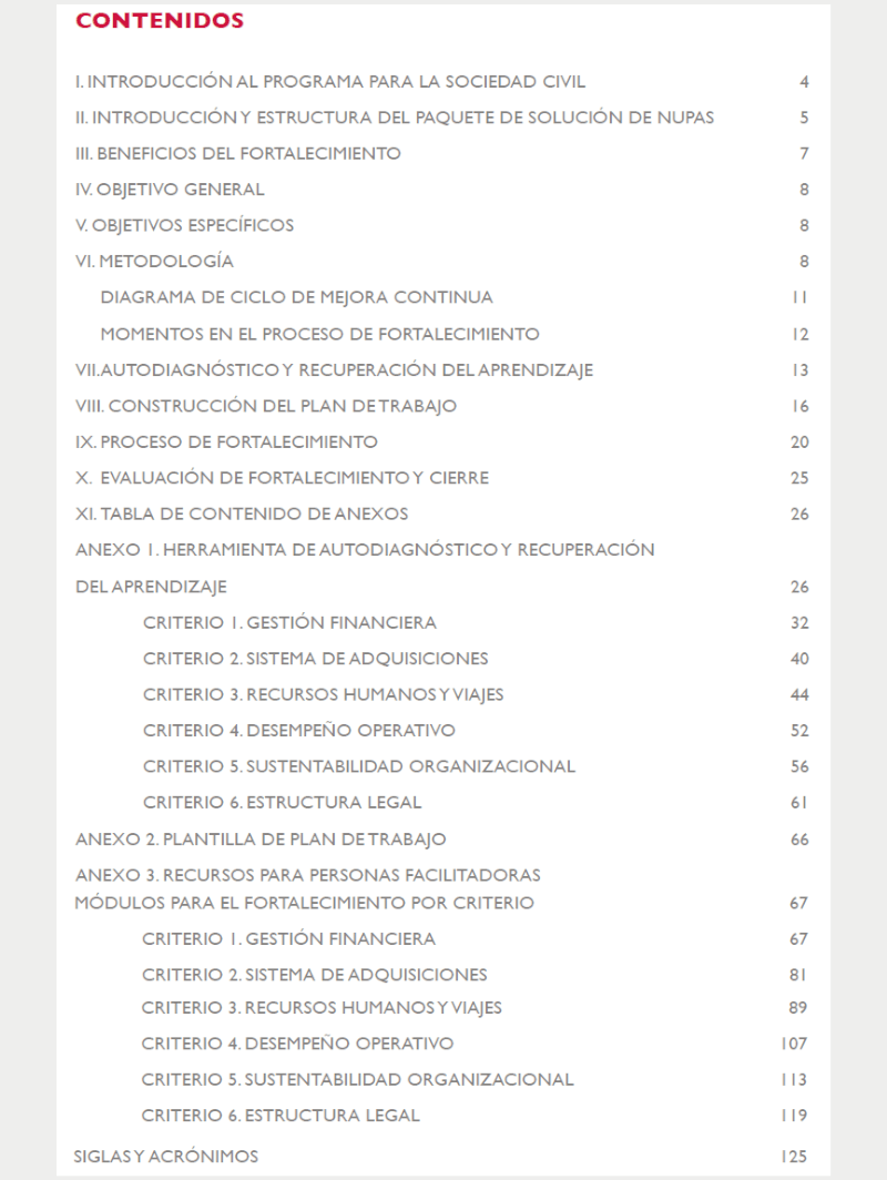 Este paquete de solución está diseñado para proporcionar al equipo de el Programa de USAID, a las organizaciones fortalecedoras y donatarias, y a las OSC, los enfoques y recursos para lograr una mejora en la evaluación denominada NUPAS (Non-US Pre-Award Survey) que es una herramienta de diagnóstico del estado actual de una organización, en seis criterios, para recibir financiamiento de USAID.
